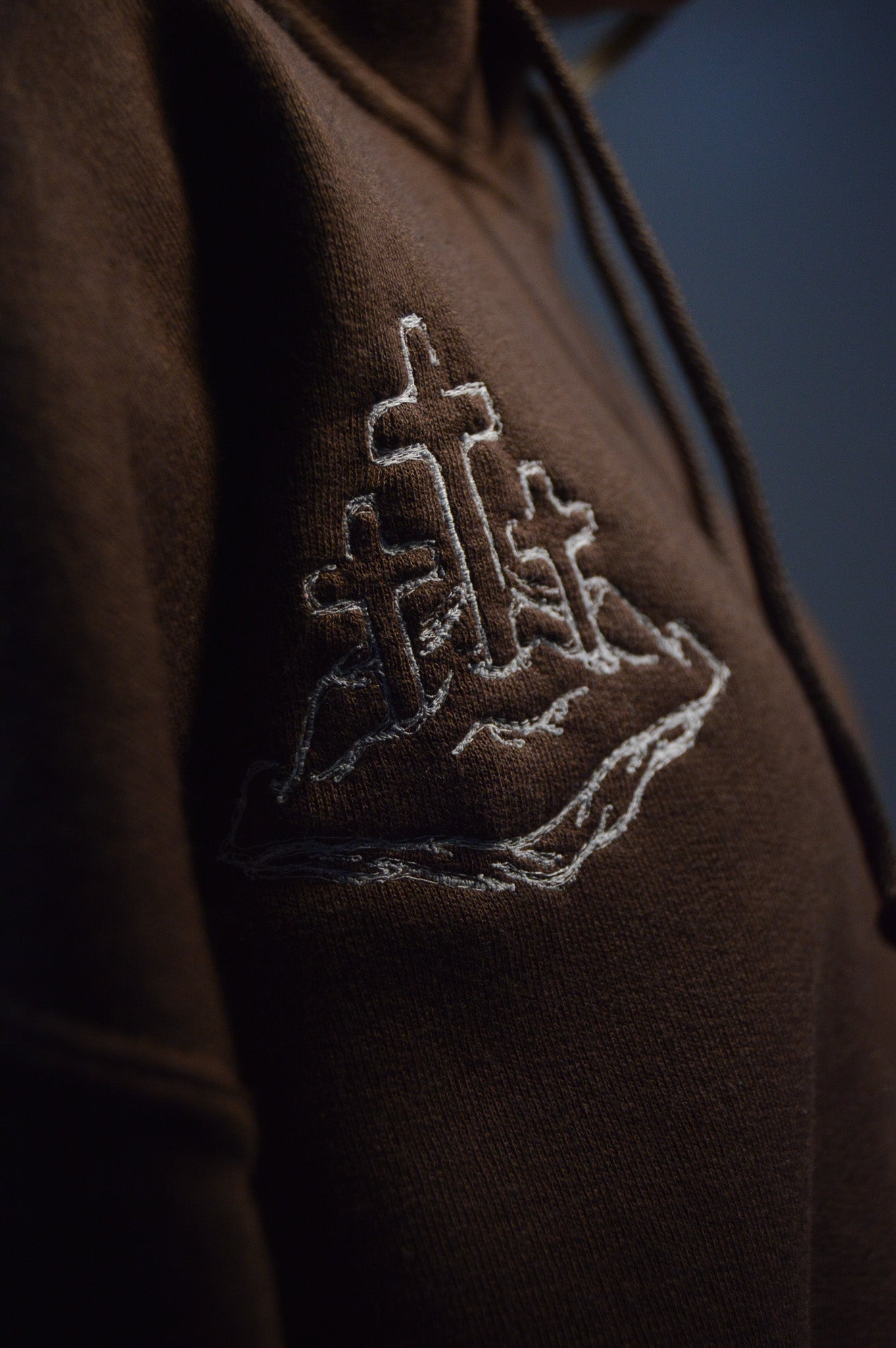 DESIGN: Featuring three crosses on a mountain (embroidered in white)